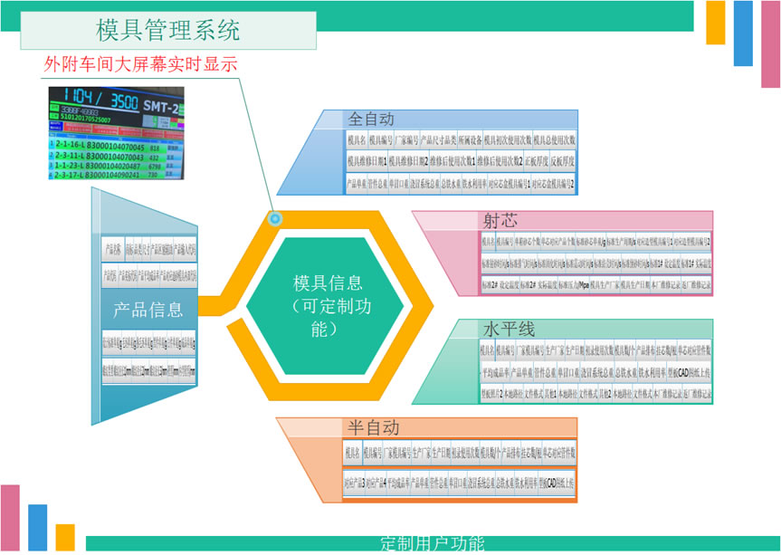 将模具相关信息分车间,产品详细记录,方便后续造型工段调用并为产品质量及后期成本核算提供真实数据,可与ERP,SAP,MES等系统并网操作,提供数据实时查询,导出,生成柱状图,拼图等,同时支持将过程与结果通过外附大屏幕进行实时显示,达到全程目视化管理。